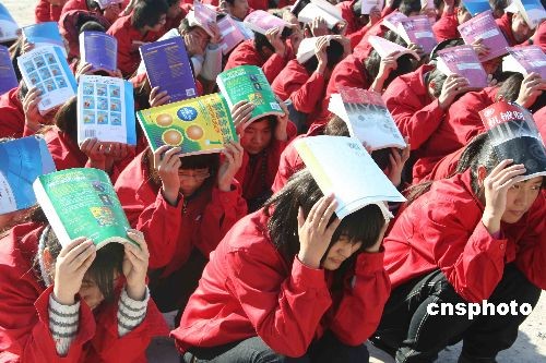11月25日上午11時,位于河北邢臺的中國二十冶技校舉行一次應(yīng)對地震、火災(zāi)等突發(fā)事件的“逃生”演習(xí)。在短短的1分鐘內(nèi),該校300余名師生順利“逃生”。中新社發(fā) 陳雷 攝