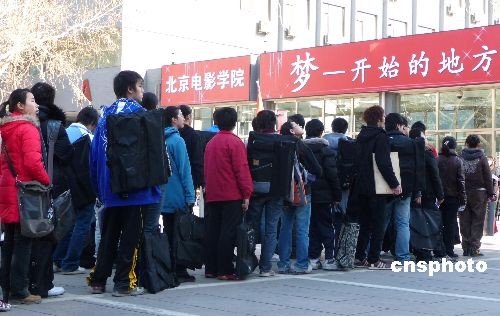 2009年2月7日,北京電影學(xué)院2009年招生初試工作已進(jìn)入了第三天,一批批來自全國各地的考生繼續(xù)為圓明星夢而拼搏努力。今年最顯著的特點(diǎn)是本色考生越來越多,濃妝艷抹、奇裝異服的考生少了。據(jù)悉,表演專業(yè)一直被認(rèn)為是北影“最難考的專業(yè)”,雖然今年的招生人數(shù)由往年的30人增加到75人,但面對4234名報考者,淘汰率仍高達(dá)98.2%。一位考官告訴記者,雖然報名者很多,但有充分準(zhǔn)備、專業(yè)水平較高的考生不超過千人,還是有很多考生很盲目。中新社發(fā) 玉龍 攝