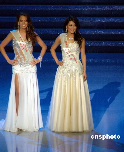 十二月一日,第五十七屆世界小姐總決賽晚會在三亞“美麗之冠”舉行,共有一百零六名來自世界各地的選手參加。圖右為香港小姐Ka Yi CHEUNG入選第十六位。中新社發 王辛莉 攝