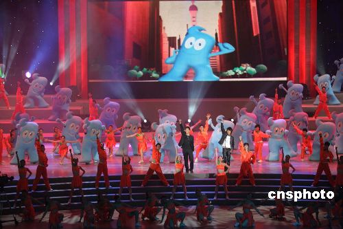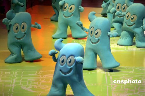 十二月十八日晚,備受海內(nèi)外矚目的中國二0一0年上海世博會吉祥物在上海大舞臺揭開神秘面紗。一個返璞歸真的、漢字“人”的藍色卡通造型——吉祥物“海寶”正式亮相!昂殹奔槲锏恼Q生,是海峽兩岸設計師共同的智慧結(jié)晶。其最初使用漢字充當吉祥物的創(chuàng)意始于臺灣知名設計師巫永堅,他的應征作品漢字卡通形象“大寶”在全球兩萬六千多件應征作品中脫穎而出,再經(jīng)過上海設計名家邵隆圖及其團隊的整合、再設計,“海寶”最終定型。中新社發(fā) 潘索菲 海牛 攝