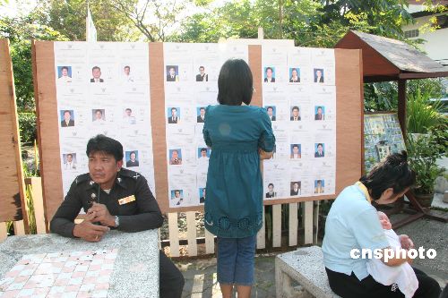圖為設在曼谷市區拉察唷庭路的一個投票點,選民在警察的保護下挑選當選者。