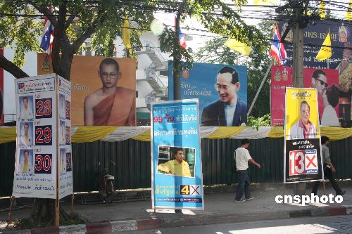 圖為曼谷市區的競選廣告牌,中間四號牌為新總理人選呼聲甚高的民主黨黨魁阿披實。