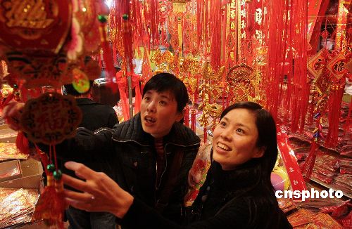 十二月三十一日,為了迎接新年,福建泉州購買喜慶用品的市民絡(luò)繹不絕,市場(chǎng)熱鬧非凡。“爆竹”掛件、彩燈、“中國結(jié)”等的銷售異常火爆,家家戶戶都將自家里里外外裝點(diǎn)一新迎接新年。中新社發(fā) 傅丹丹 攝