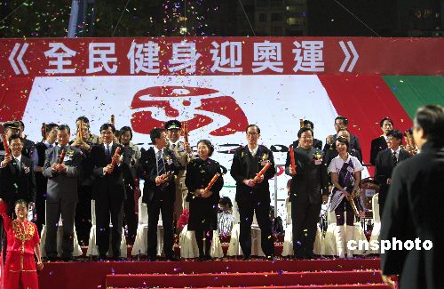 一月二十一日晚,香港舉行“全民健身迎奧運”活動,慶祝奧運倒計時二百天,特區民政事務局局長曾德成、香港基本法委員會副主任梁愛詩、中聯辦青年工作部副部長張春生等嘉賓及六千多名青少年參與活動共迎奧運。中新社發 王麗南 攝