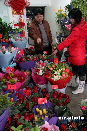 2月13日,顧客在挑選鮮花。為迎接“情人節”,山東威海各花店生意紅火,許多顧客為女友和母親訂購鮮花,鮮花市場銷售異常火爆,許多花店為此招臨時工幫忙。中新社發 海云飛 攝
