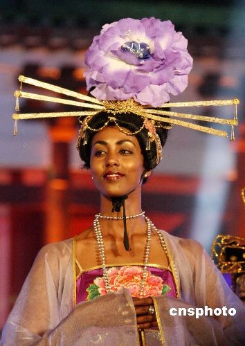 4月1日晚,2008國際旅游小姐總決賽“迪斯科皇后”單項決賽晚會在河南洛陽舉行。來自世界115個國家的115位佳麗參賽,在晚會現場4位不同膚色的佳麗當場“秀”起了中國傳統服飾--唐裝。中新社發 曾憲平 攝