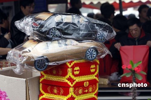 臺北民眾一早來到陽明山第一公墓祭拜祖先,制作精美的紙轎車祭品供亡者在天之靈有個現代的交通工具。中新社發 杜洋 攝