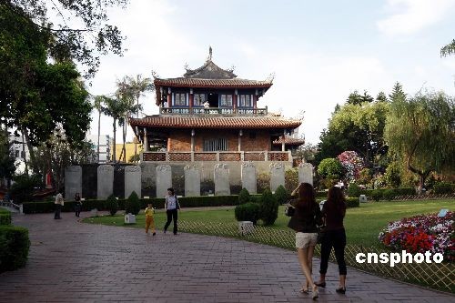 赤嵌樓位于臺南市中區(qū)赤嵌樓與民族路交叉口,原為荷蘭人所建。早期的漢人稱荷蘭人為紅毛,所以也把赤嵌樓叫做紅毛樓,或稱番仔樓;目前赤嵌樓列為國家一級古跡,也是臺南代表性的名勝,赤嵌樓的文物與建筑歷經(jīng)荷蘭、明鄭及滿清時代,初建于公元1650年,其建材據(jù)說皆由荷蘭人自海外運(yùn)來,稱為普羅民遮城,系荷蘭人在漢人起義抗荷的郭懷一事件后所興建的。在鄭成功攻占臺灣以后,曾經(jīng)改普羅民遮城為“東都承天府”,并以赤嵌樓做為全島最高的行政機(jī)構(gòu),隔臺江與今安平古堡相對,十分具有歷史與文化的價值。中新社發(fā) 杜洋 攝