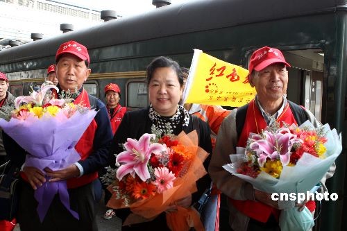 4月10日,2008年首列紅色旅游專列從廣東梅州市抵達天津,1000多名由退休老人組成的旅行團將走訪天津及北京主要紅色旅游景點,同時標志著“紀念三大戰役勝利60周年系列主題活動”正式啟動。中新社發 趙雋 攝