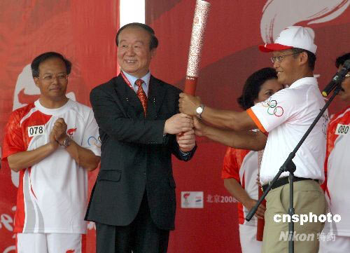 圖為北京奧組委執(zhí)行副主席蔣效愚(左二)向雅加達(dá)省政府贈(zèng)送“祥云”火炬。 沈晨 攝