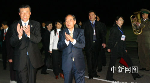 4月28日凌晨0時(shí)20分,載有北京奧運(yùn)圣火的“奧運(yùn)圣火號(hào)”平穩(wěn)地降落在平壤國(guó)際機(jī)場(chǎng)。朝鮮首都平壤是北京奧運(yùn)圣火海外傳遞“和諧之旅”的第18站。這是奧運(yùn)圣火自一九三六年開(kāi)始傳遞活動(dòng)以來(lái),首次來(lái)到朝鮮。圖為北京奧組委執(zhí)行副主席李炳華(左二)與中國(guó)駐朝鮮大使劉曉明(左)在機(jī)場(chǎng)受到熱烈歡迎。沈晨 攝