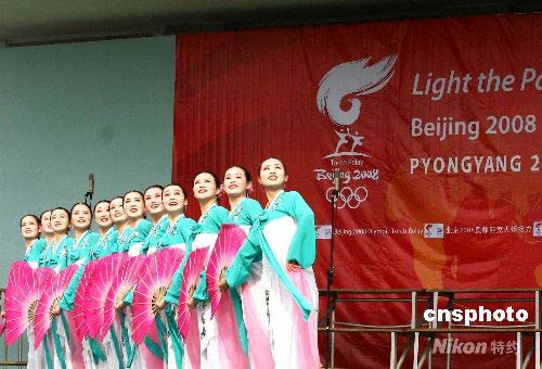圖為朝鮮藝術家在慶典儀式上表演節目祝福北京奧運。 中新社發 沈晨 攝