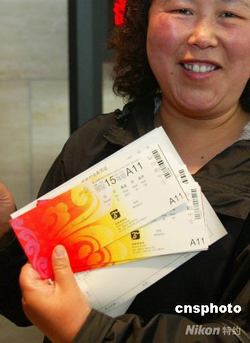 5月5日,北京奧運會第三階段門票銷售正式啟動。由于這一階段采取“先到先得”的售票原則,公眾購票熱情十分高漲。據奧運票務中心統計,截至當日上午11時40分,男足半決賽和決賽、男子110米欄半決賽、男籃預賽等8個場次的門票已售罄。第三階段銷售將投放奧運門票138萬張,涵蓋16個大項的244個比賽場次。圖為北京一位民眾買到票后異常高興。 中新社發 富田 攝