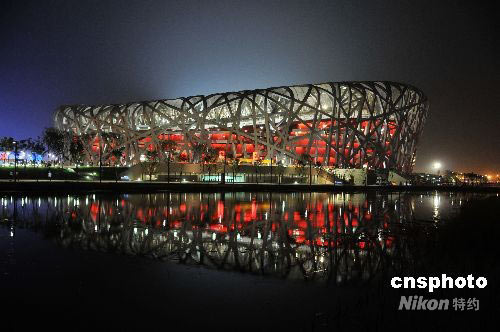 5月22日至25日,“好運(yùn)北京”2008中國(guó)田徑公開(kāi)賽在國(guó)家體育場(chǎng)“鳥(niǎo)巢”舉行。比賽期間的夜晚,國(guó)家體育場(chǎng)燈火輝煌,周邊濕地湖水映襯著“鳥(niǎo)巢”,顯得分外秀麗。中新社發(fā) 馮軍 攝