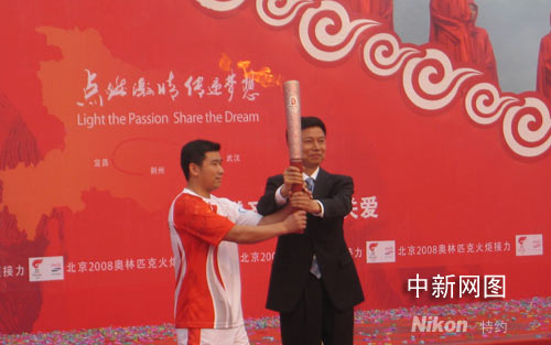 六月二日上午八時十二分,北京奧運會火炬接力荊州傳遞開始,該市傳遞路線全長為十八點八公里。圖為體操奧運冠軍鄭李輝從中共荊州市委書記應代明手中接過火炬開始第一棒傳遞。 中新社發 艾啟平 攝