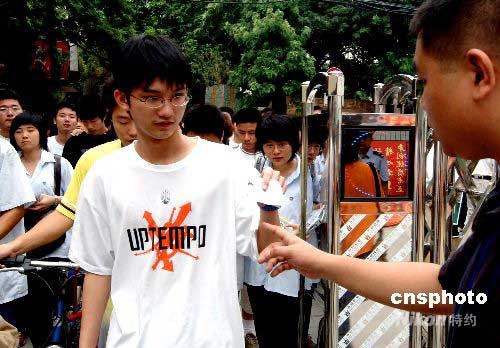 參加首日高考的福州考生步入福州銅盤中學(xué)考點(diǎn)時(shí),主動(dòng)出示準(zhǔn)考證和身份證。中新社發(fā) 劉可耕 攝