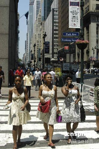 6月10日,紐約當(dāng)?shù)貧鉁剡_到華氏97度,較往年6月日均最高氣溫高出十幾度。熱浪襲人,紐約當(dāng)?shù)鼐用窈陀慰图娂娗鍥鲅b扮,消磨酷暑。中新社發(fā) 魏晞 攝