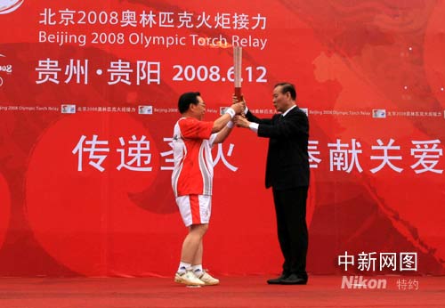 6月12日,北京奧運火炬在貴陽傳遞,第一棒火炬手、中國探月工程首席科學家歐陽自遠從貴州省委書記石宗源手中接過“祥云”火炬。記者周兆軍攝