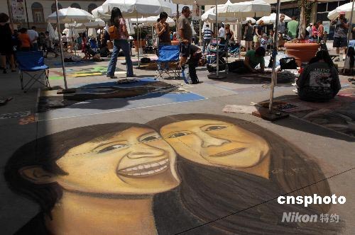 當地時間六月十五日,第十六屆帕薩迪納粉筆畫藝術節在加州帕薩迪納市街頭舉行。這個號稱“世界上規模最大”的街頭繪畫藝術節,吸引約六百名繪畫藝術家和愛好者,消耗約兩萬五千支彩色粉筆,數百幅作品占據兩個街區的人行道。中新社發 張煒 攝