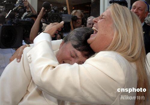 女同性戀者羅賓·泰勒(左)和戴安·奧爾森(右),正式在洛杉磯縣政府大樓門前登記結婚。中新社發(fā) 張煒 攝