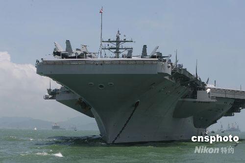 六月十九日,全球最大、最先進的核動力航空母艦美國“里根號”及其戰斗群抵達香港,進行為期三至四日的訪問。這是二00六年以來“里根號”的第三次訪港。中新社發 武仲林 攝