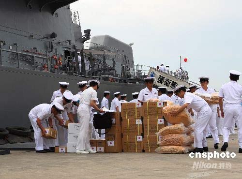 日本艦艇“漣”號(hào)訪華,隨艦搭載向四川災(zāi)區(qū)提供的救援物資。中新社發(fā) 宋吉河 攝
