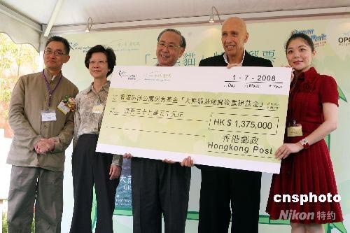 香港郵政將發售限量版大熊貓掌印及郵票珍藏紀念郵品籌得的一百三十多萬港幣轉贈給香港海洋公園保育基金,以支持重建四川大熊貓基地設施。中新社發 武仲林 攝