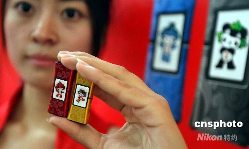 七月二日,北京2008年奧運特許商品奧運吉祥物電子紀念章、聯想火炬閃存盤等正式推向市場。特別是聯想奧運吉祥物閃存盤由于價格適中、實用性強,一上市就受到消費者的喜愛。 中新社發 任海霞 攝