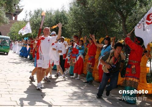 第201棒火炬手、德國汽車工程師羅曼在嘉峪關關城內傳遞。中新社發 周兆軍 攝