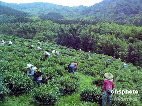 七月間正值臺灣阿里山地區采茶季節,大清早開始工作的茶農在茶園采茶。中新社發 徐長安 攝