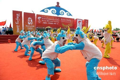 7月8日,奧運火炬在內蒙古呼和浩特市傳遞。蒙古族是擅長摔跤的民族,扮成福娃的當地孩童在進行“摔跤角力”表演。中新社發 廖攀 攝