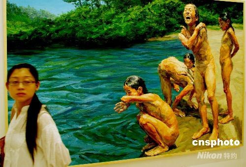 7月9日,以“色彩與奧林匹克”為主題的2008·第三屆中國北京國際美術雙年展吸引了眾多觀眾,來 自81個國家的747件當代繪畫和雕塑作品集中展出,其中很多作品都是世界各國藝術家專為北京奧運會創作的。中新社發 楊慧峰 攝