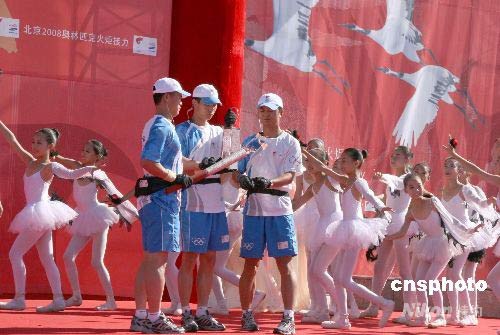 7月13日,北京奧運火炬在“丹頂鶴之鄉”齊齊哈爾傳遞。當圣火護衛隊員點燃火炬時,當地小朋友扮作一群仙鶴在火炬周圍翩翩起舞。 中新社發 周兆軍 攝