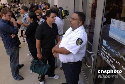 當(dāng)?shù)貢r(shí)間7月14日上午,數(shù)百名儲戶在加州帕薩迪納市的“因迪美聯(lián)邦銀行”門口排隊(duì)等待提取現(xiàn)金。 受次貸危機(jī)影響,6月底以來,美國最大的抵押貸款商因迪美銀行(IndyMac Bank)遭客戶擠兌,在11天內(nèi)被客戶提走現(xiàn)金13億美元,本月11日,因流動性嚴(yán)重不足,該銀行被美國儲蓄管理局勒令關(guān)閉,并將其業(yè)務(wù)轉(zhuǎn)交至聯(lián)邦存款保險(xiǎn)公司運(yùn)營,該銀行成為美國次貸危機(jī)以來被關(guān)閉的最大抵押貸款商。被接管并更名后的“因迪美聯(lián)邦銀行”14日開始營業(yè),大批客戶仍擔(dān)心財(cái)產(chǎn)受損,一大早便排隊(duì)等待提現(xiàn)。中新社發(fā) 張煒 攝