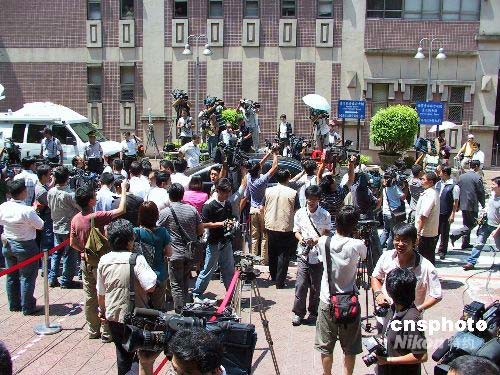 七月二十一日,臺北地方法院開庭審理臺灣海軍前軍官雷學明控告陳水扁等人誹謗案。這是陳水扁卸任臺灣地區領導人后首度至法院出庭,臺灣媒體對此高度關注。圖為庭審結束后,陳水扁離開時,媒體仍鍥而不舍圍堵其坐車。中新社發 徐長安 攝