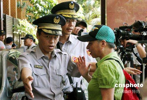 7月21日,臺灣前海軍中將雷學明等控告陳水扁等人誹謗案在臺北地方法院開庭。這是是陳水扁卸任臺灣領導人后首度至法院出庭,創下卸任領導人以被告出庭的首例。為此,大批警方出動維持秩序,不過仍發生陳水扁上午在步入法院時遭一民眾踹一腳的意外。圖為警方在法院門口勸離一民眾。中新社發 黃少華 攝