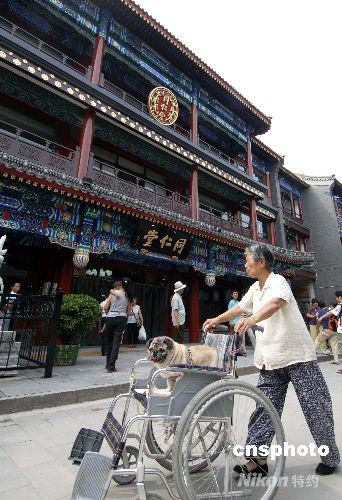 7月30日,一位老人到重新開業的大柵欄街遛狗。當日,有著近500年歷史的北京大柵欄商業街完成近年來最大規模改造后重張迎客。中新社發 王東明 攝