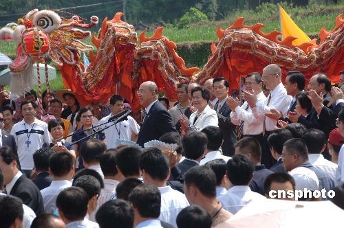 中國國民黨主席吳伯雄回到福建永定縣下洋鎮思賢村謁祖,受到家鄉父老的歡迎。中新社發 鄭祚聲 攝