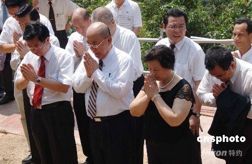 八月十四日,回到祖籍地--福建永定縣下洋鎮(zhèn)思賢村的中國國民黨主席吳伯雄,特地前往祖墳祭拜祖先。圖為吳伯雄夫婦一行向祖墳鞠躬。中新社發(fā) 鄭祚聲 攝