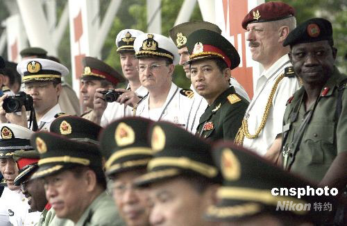 武官團觀看了駐軍的軍事科目演示。中新社發(fā) 張勤 攝