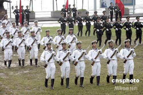 圖為駐港部隊槍械團體操表演。中新社發(fā) 張勤 攝