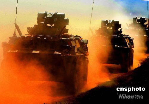 9月25日上午,中國(guó)人民解放軍“礪兵--2008”演習(xí)在塞北大漠展開。這場(chǎng)演習(xí)是一場(chǎng)在復(fù)雜地形、復(fù)雜電磁環(huán)境、作戰(zhàn)信息“背靠背”情況下,跨軍區(qū)聯(lián)合、多兵種協(xié)同、陸航空一體、實(shí)兵檢驗(yàn)性戰(zhàn)術(shù)集團(tuán)立體機(jī)動(dòng)攻防戰(zhàn)斗演習(xí)。中新社發(fā) 宋吉河 攝