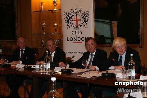 當?shù)貢r間6日下午,紐約市長邁克爾·布隆博格在倫敦金融城,與倫敦市長鮑里斯·約翰遜及倫敦金融城的高層舉行圓桌會談,商討金融形勢。圖為布隆博格(左二)、約翰遜(右一)、倫敦金融城資源與政策委員會主席斯圖亞特·弗雷澤(右二)和副主席邁克爾·斯奈德(左一)。中新社發(fā) 李鵬 攝