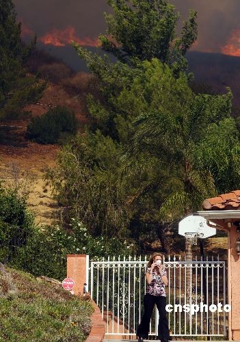 山林大火正逼近洛杉磯近郊的民宅,房屋主人焦急萬分,幾分鐘后,她不得不撤離家園。中新社發 張煒 攝