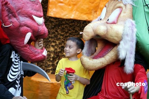 十月二十一日,香港時代廣場設置“怪異南瓜陣”迎接萬圣節到來。中新社發 洪少葵 攝