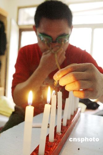 10月21日,開封民間藝人凌春江用眼睛將蠟燭吹滅。他戴上特制的眼鏡,從兩眼中聚氣到一根管子內(nèi),一分鐘吹滅一排蠟燭。如今,身懷絕技的凌春江被中華民間絕技藝術(shù)團(tuán)聘為特邀演員,經(jīng)常到全國(guó)各地巡演。中新社發(fā) 慎重 攝