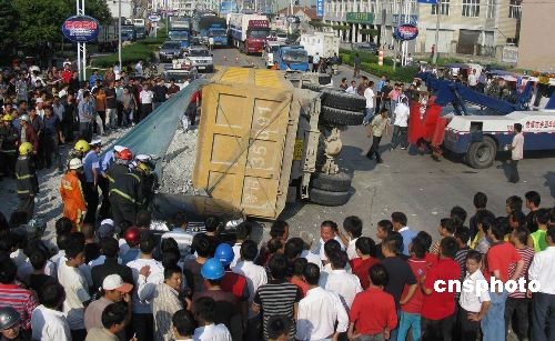 圖:寧波一滿載泥土貨車側翻壓死轎車司機