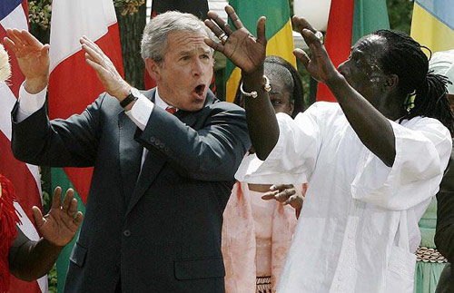 2007年4月26日,布什總統和夫人勞拉在白宮玫瑰花園參加“瘧疾關注日”活動,布什總統及夫人勞拉被舞蹈演員邀請一起上臺作即興表演。布什興致勃勃的敲打非洲鼓,并試圖和舞蹈演員學跳非洲傳統舞蹈。作者:旺仔