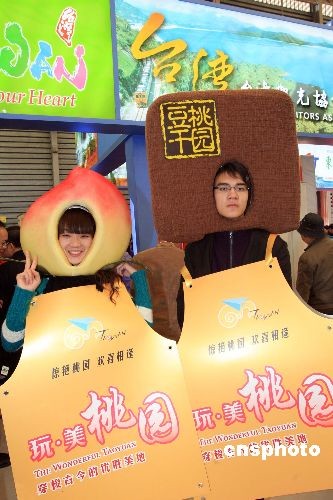 11月20日,臺灣桃園在上海“二00八中國國際旅游交易會”上,推銷特色名產“豆干”、“水蜜桃”,吸引上海人體驗桃園縣自然人文之美。中新社發 潘索菲 攝