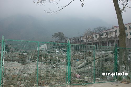 為尊重遇難學生的家長意見,避免參觀者踩在逝者長眠之地,11月21日,北川中學地震遺址前正在加裝綠色的圍欄。中新社發 肖龍聯 攝